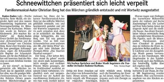 (...) Zwei Bühnenarbeiter kamen plötzlich auf die Idee, in die Rollen von Max und Moritz zu schlüpfen – und so begann das Stück. (...) Diana Barth als Moritz und Markus Veith alias Max lebten ihre Rollen im wahrsten Sinne des Wortes aus, sprühten förmlich vor Engagement und rissen die Kinder mit. „Ziel ist es schließlich auch, die Kinder zu animieren, kreativ und spontan zu sein“, erklärt die Regisseurin. Der Funke sprang sofort über, was die Schauspieler und besonders Barbara Pittner sichtlich freute.(...)